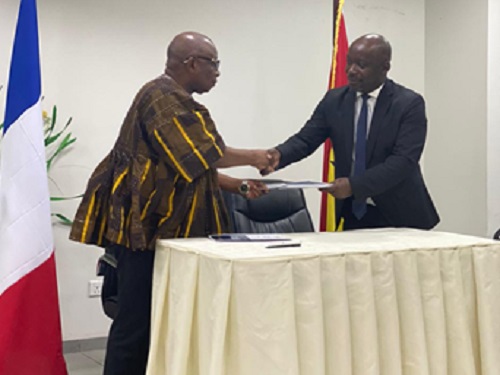 Agyeman-Manu exchanging the signed agreement with Stephane Gokou, Sanofi Foundation General Manager for Sub-Saharan Africa