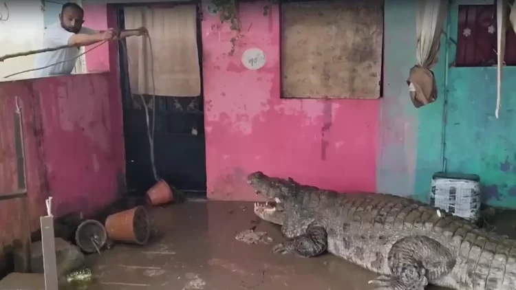 As if having to deal with the water flooding their homes and streets wasn’t enough, the people of Vadodara have to be on the lookout for giant crocodiles waiting to snatch their animals or even attack them. Videos of giant reptiles walking through the streets, chilling on house roofs, or swimming in canals with dead animals between their jaws have been doing the rounds on Indian social media ever since the Vishwamitri River overflowed last week. The river is home to hundreds of freshwater crocodiles, at least two dozen of which were caught in Vadodara between August 27 and 29.