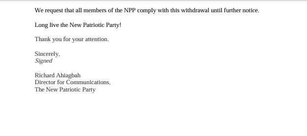 The party assured its members and the public that this withdrawal would not affect its commitment to holding the government accountable. It further instructed all members of the NPP to comply with the directive until further notice.