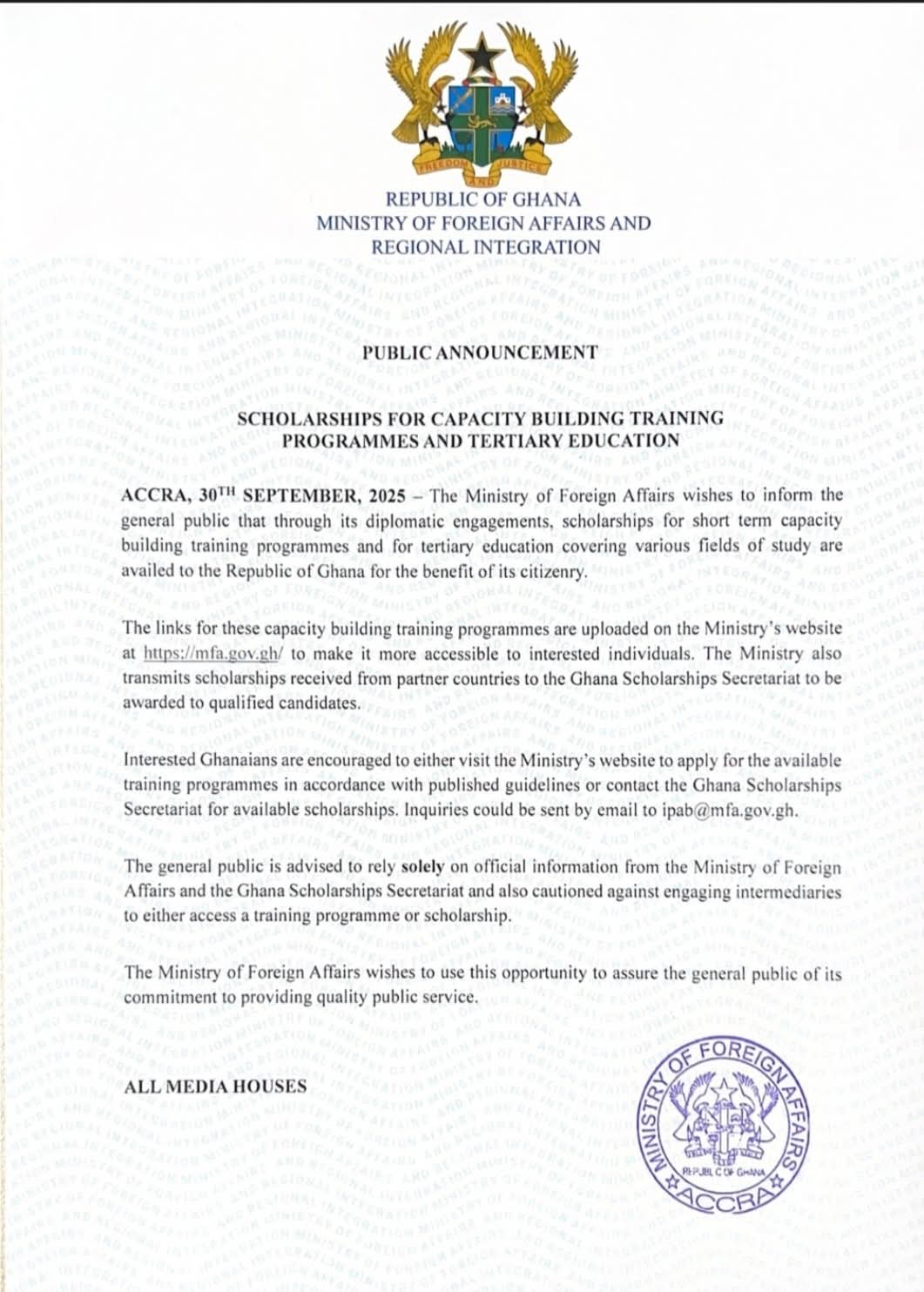 In a statement issued on Tuesday, September 30, 2025, the Ministry explained that the scholarships cover short-term capacity-building training programmes as well as tertiary education opportunities across various fields of study.