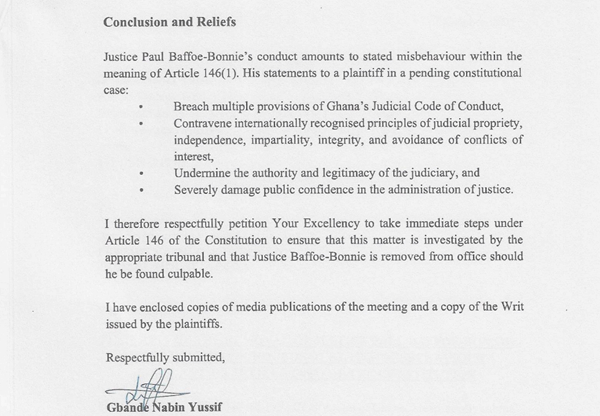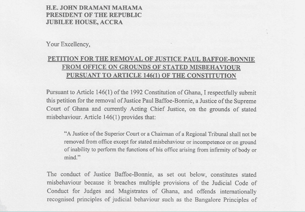 “I respectfully submit this petition for the removal of Justice Paul Baffoe-Bonnie, a Justice of the Supreme Court of Ghana and currently Acting Chief Justice, on the grounds of stated misbehaviour. Article 146(1) provides that: A Justice of the Superior Court or a Chairman of a Regional Tribunal shall not be removed from office except for stated misbehaviour or incompetence or on ground of inability to perform the functions of his office arising from infirmity of body or mind.”