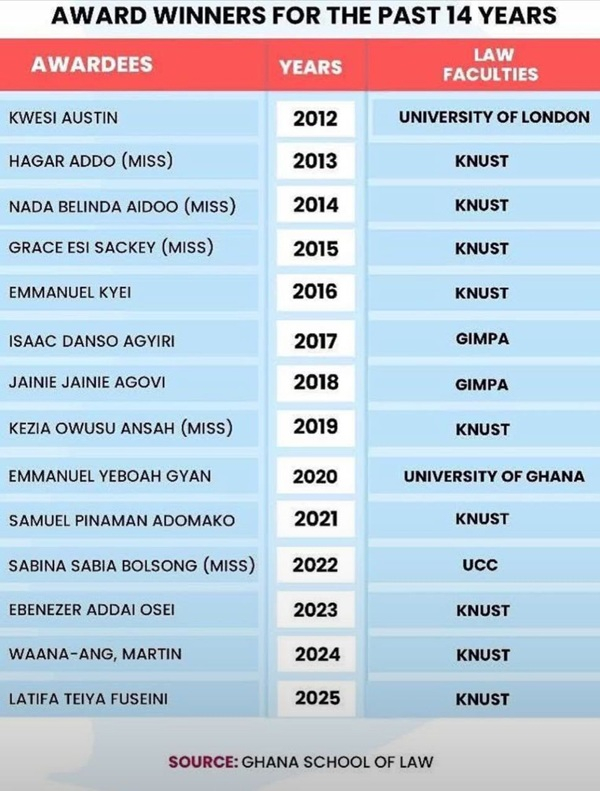 A report cited by GhanaWeb and sourced from the Ghana School of Law on October 10, 2025, details the number of times alumni from some universities in the country have received the John Mensah Sarbah Memorial Prize since 2012.