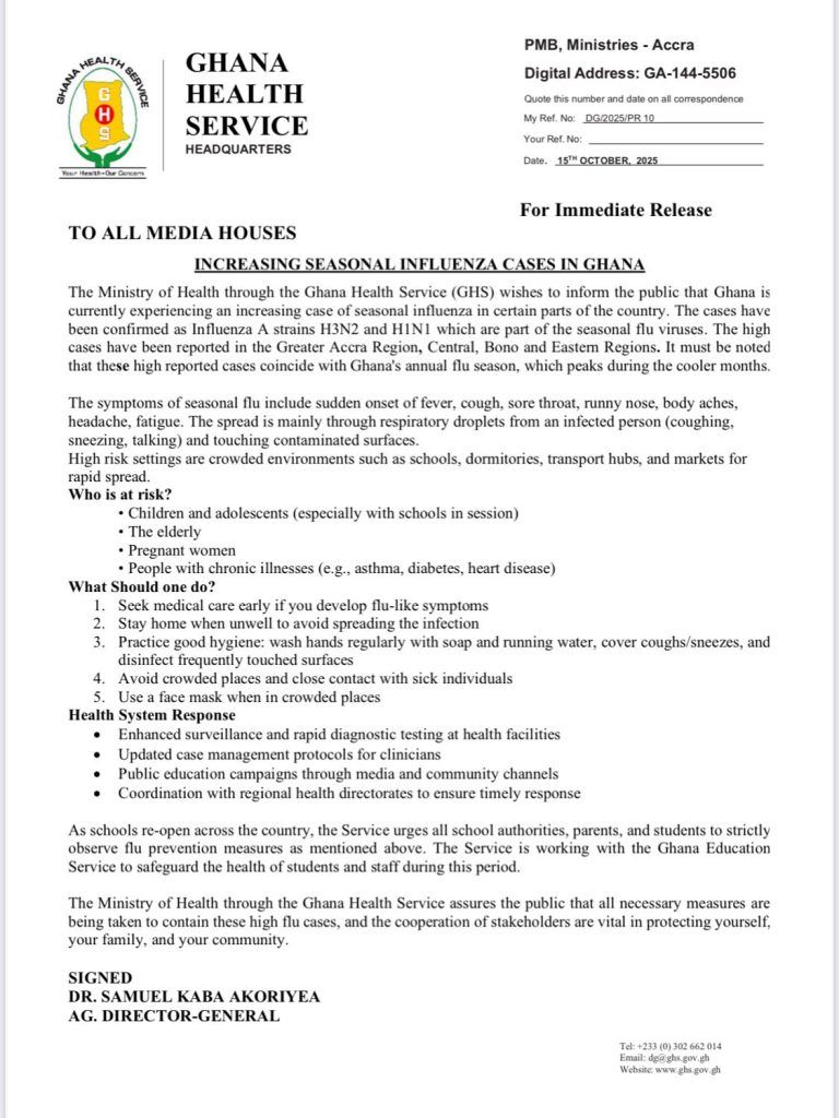 An official notice, dated October 18, 2025, confirmed that Greater Accra, Central, Bono, and Eastern Regions have recorded Influenza A strains H3N2 and H1N1, both of which are common seasonal flu variants.