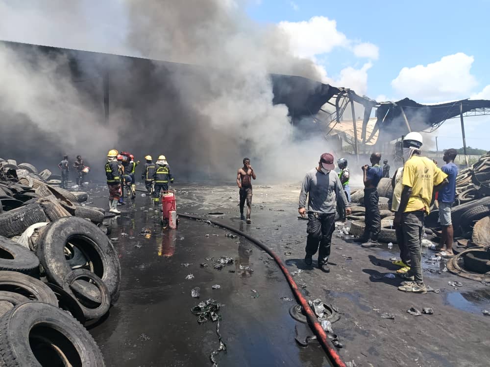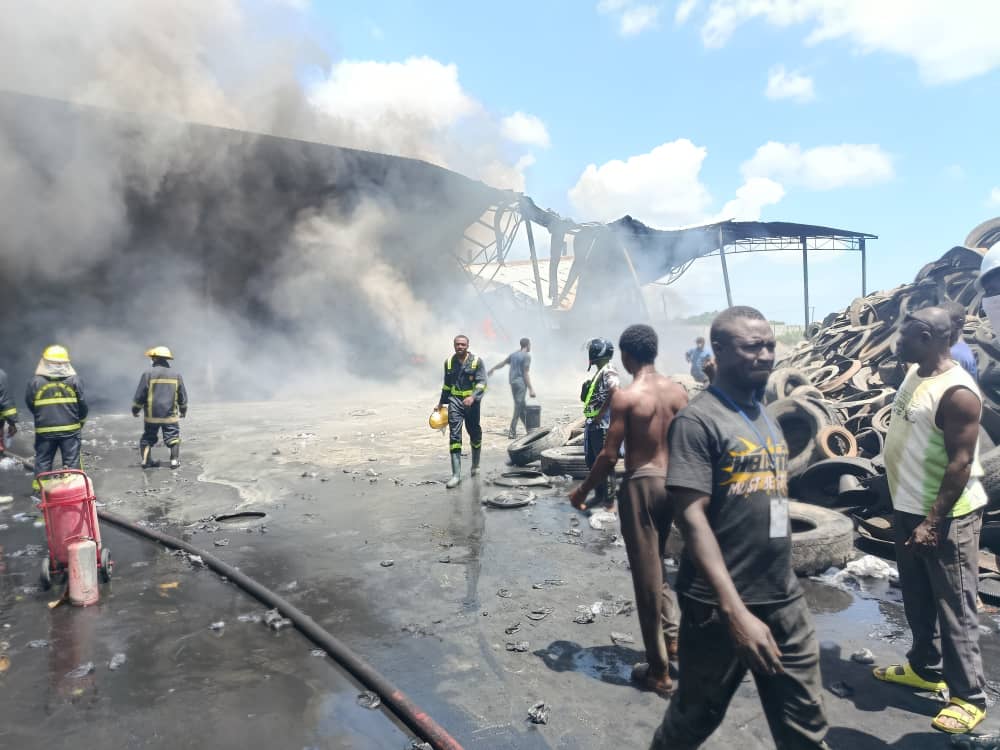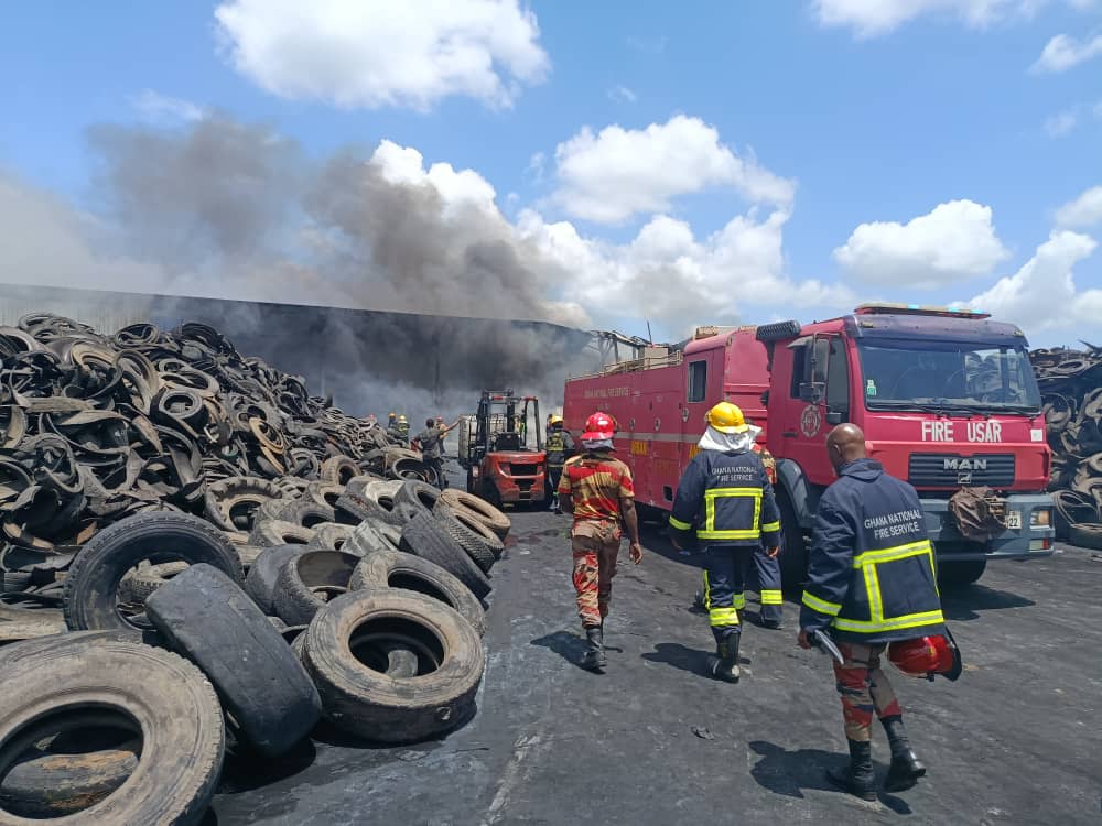 According to the GNFS, the fire was confined by 12:55 p.m., brought under control by 8:08 p.m., and completely extinguished at 10:39 p.m. An excavator was later deployed to assist in separating heaps of burning tyres during the overhaul process.