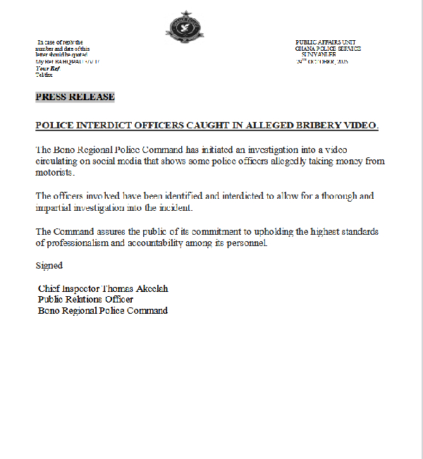 In a statement dated October 29, 2025, and signed by Chief Inspector Thomas Akeelah, Public Relations Officer, for the Bono Region said the officers involved have been identified and placed on interdiction to allow for a thorough and impartial investigation into the matter.