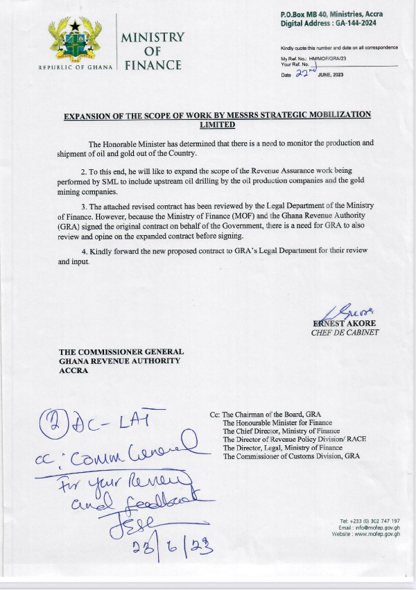 However, since the original contract had been signed by the Ministry of Finance and the Ghana Revenue Authority (GRA) on behalf of the government, “there is a need for GRA to also review and opine on the expanded contract before signing,” it read.