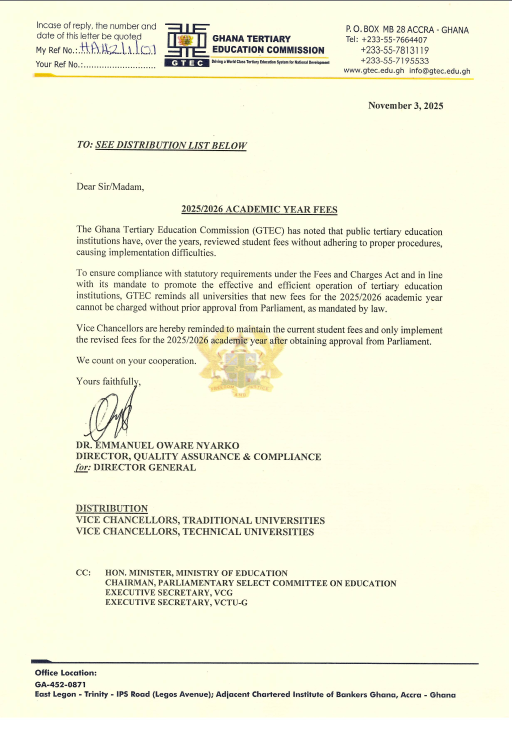 The directive, signed by Dr. Emmanuel Oware Nyarko, Director of Quality Assurance and Compliance, on behalf of the Director-General of GTEC, was copied to the Minister of Education, the Chairman of the Parliamentary Select Committee on Education, and the Executive Secretaries of both the Vice Chancellors Ghana (VCG) and the Vice Chancellors Technical Universities Ghana (VCTU-G).