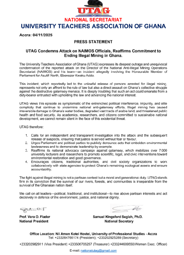 The University Teachers Association of Ghana (UTAG) has condemned what it describes as a “shocking and unacceptable” attack on officials of the National Anti-Illegal Mining Operations Secretariat (NAIMOS), allegedly involving the Member of Parliament for Asutifi North, Ebenezer Kwaku Addo.