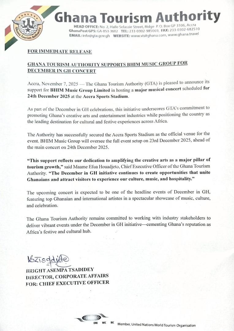 The Ghana Tourism Authority (GTA) has officially announced its support for BHIM Group Limited in hosting the highly anticipated BHIM Festival, now scheduled for December 24, 2025, at the Accra Sports Stadium.