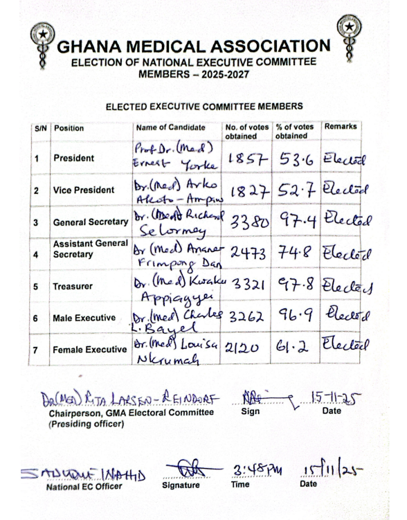 The results were declared by the Chairperson of the GMA Electoral Committee, Dr Aija Larsen-Reindorf, following the close of voting on Saturday, November 15, 2025.