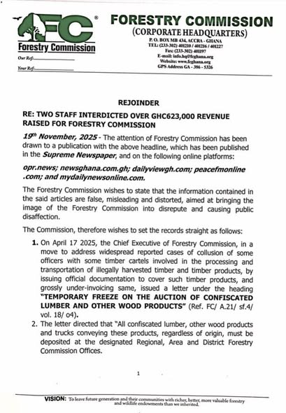 The Forestry Commission has refuted media reports claiming that two of its staff members were interdicted over GHC623,000 in revenue.