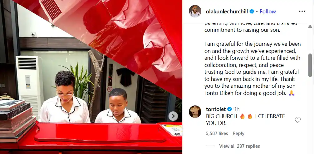 Churchill also expressed gratitude to Tonto Dikeh for her role as King Andre’s mother, praising her for doing a good job and helping to foster peace for their child.