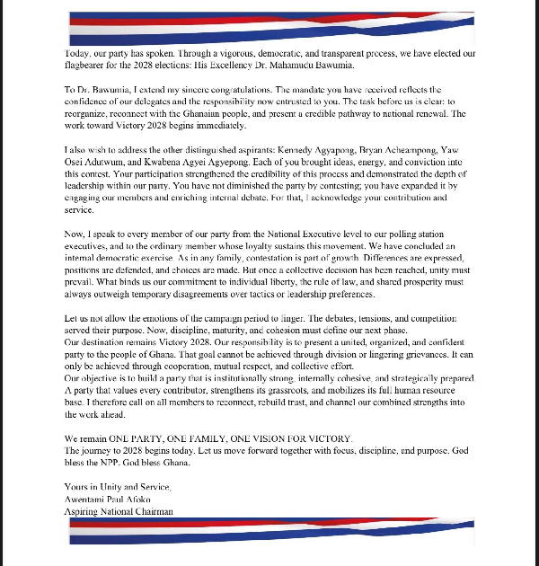 Afoko signed off the message as “Yours in Unity and Service,” reaffirming his commitment as an aspiring National Chairman of the New Patriotic Party.