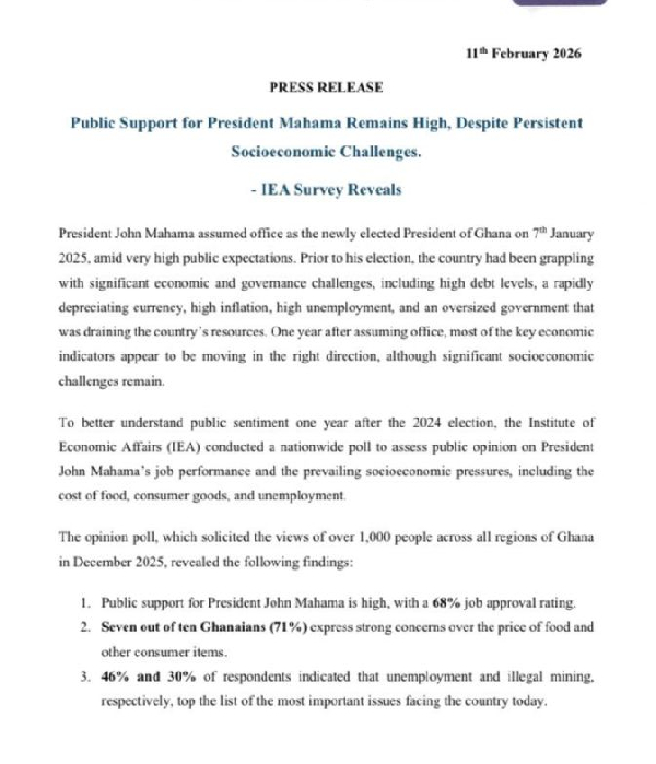 In a press release dated February 11, 2026, the IEA disclosed that 68 percent of respondents approve of the President’s performance in office, while 22 percent disapprove and 10 percent expressed no opinion.