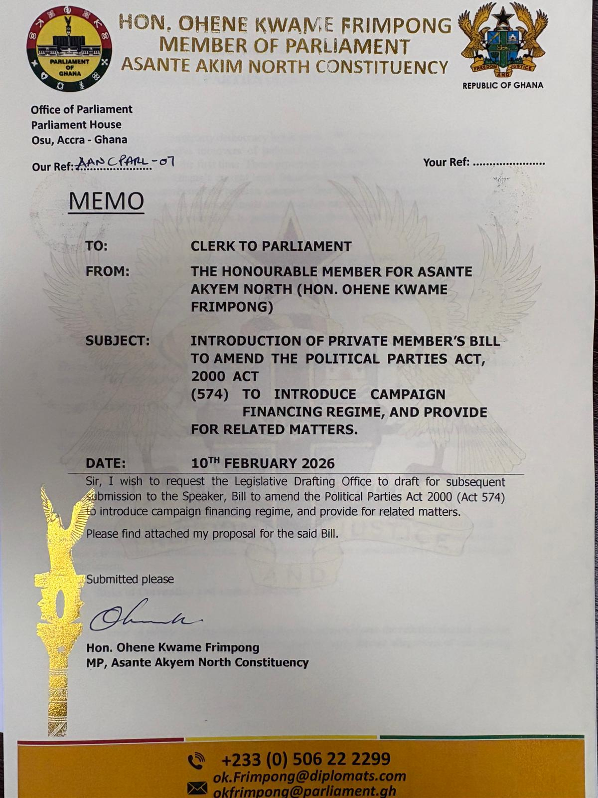 In a press statement issued on Tuesday, 10th February 2026, the MP sought to initiate Private Member’s Bill to amend Political Parties ACT 2000 (ACT 574), to introduce campaign financial regime, and to provide for financial related matters.