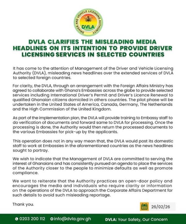 In a statement issued by the Authority and attributed to its Chief Executive Officer, Julius Neequaye Kotey, on Thursday, February 26, 2026, the DVLA described earlier media reports as misleading and explained that its planned initiative aims to improve access to services for Ghanaians living outside the country.