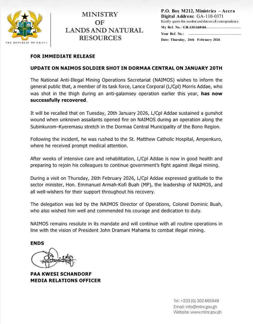 During a visit on Thursday, L/Cpl Addae expressed appreciation to the Minister for Lands and Natural Resources, Emmanuel Armah-Kofi Buah, the leadership of NAIMOS, and members of the public for the support he received during his recovery.