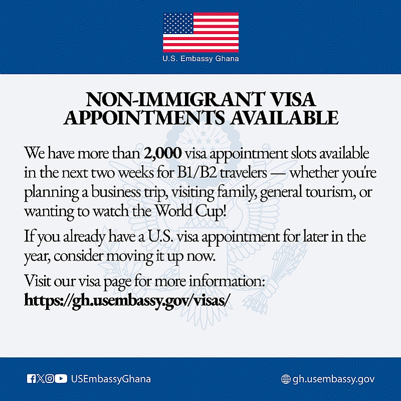 The U.S. Embassy in Ghana has announced the release of more than 2,000 additional visa appointment slots to be made available over the next two weeks for B1 and B2 travelers.