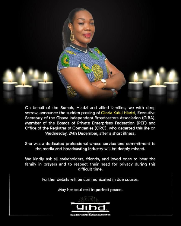 “On behalf of the Sumah, Hiadzi, and allied families, we, with deep sorrow, announce the sudden passing of Gloria Kafui Hiadzi, Executive Secretary of the Ghana Independent Broadcasters Association (GIBA), who departed this life on Wednesday, December 24, after a short illness,” the statement read.