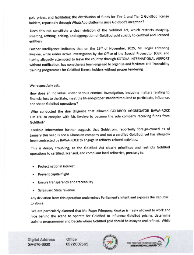 The coming days leading to Gyamfi’s January 5 exposé will test whether detailed responses can address growing concerns about GoldBod’s operational efficiency, transparency, and environmental safeguards. As Parliament prepares to reconvene in the new year, questions about whether a bipartisan investigative committee will be established to examine gold aggregation arrangements remain unresolved.