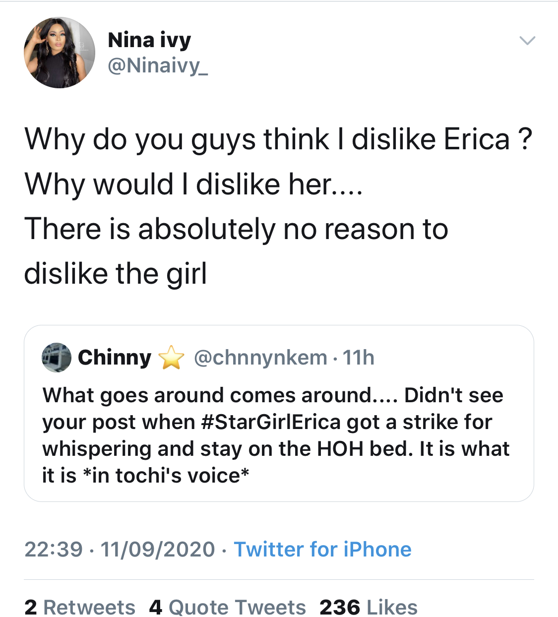 Former BBNaija housemate, Nina Ivy has set the record straight as she has stated that she doesn’t dislike disqualified housemate, Erica.