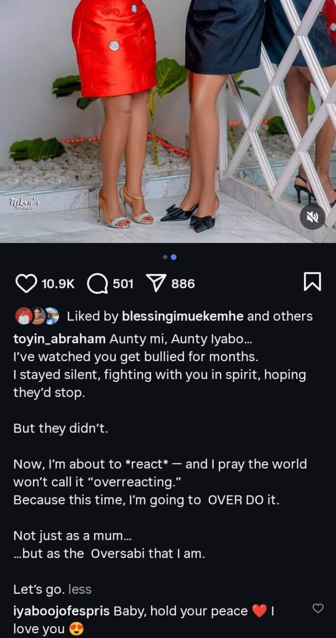 On her Instagram page, she noted how she had watched Iyabo get bullied for months, and she stayed silent, fighting with her in spirit and hoping they’d stop. But they didn’t, and now, she is ready to react.