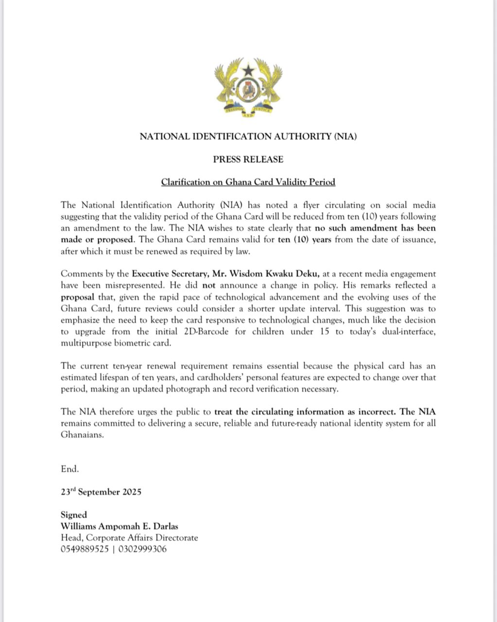 The NIA urged the public to disregard the misinformation and reaffirmed its commitment to delivering a secure, reliable, and future-ready national identity system for all Ghanaians.