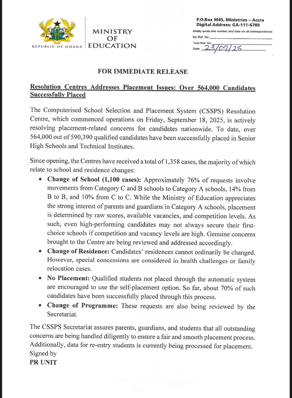 The Ministry of Education has confirmed that over 564,000 out of 590,390 qualified students have been placed in Senior High Schools and Technical Institutes through the Computerised School Selection and Placement System (CSSPS).