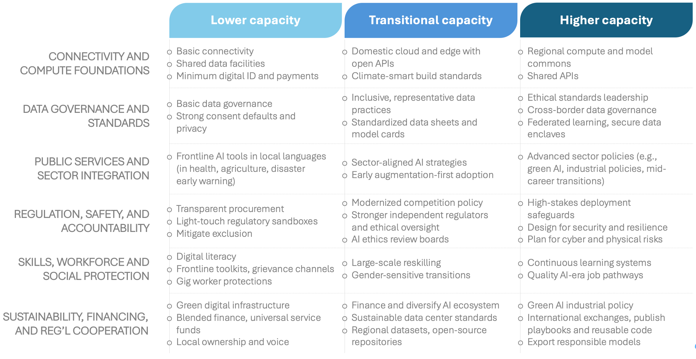 - Higher-capacity countries have the opportunity to lead on standards, safety, and sustainability. They can strengthen regulatory oversight, push for energy-efficient AI research, and contribute regionally by sharing models and expertise.