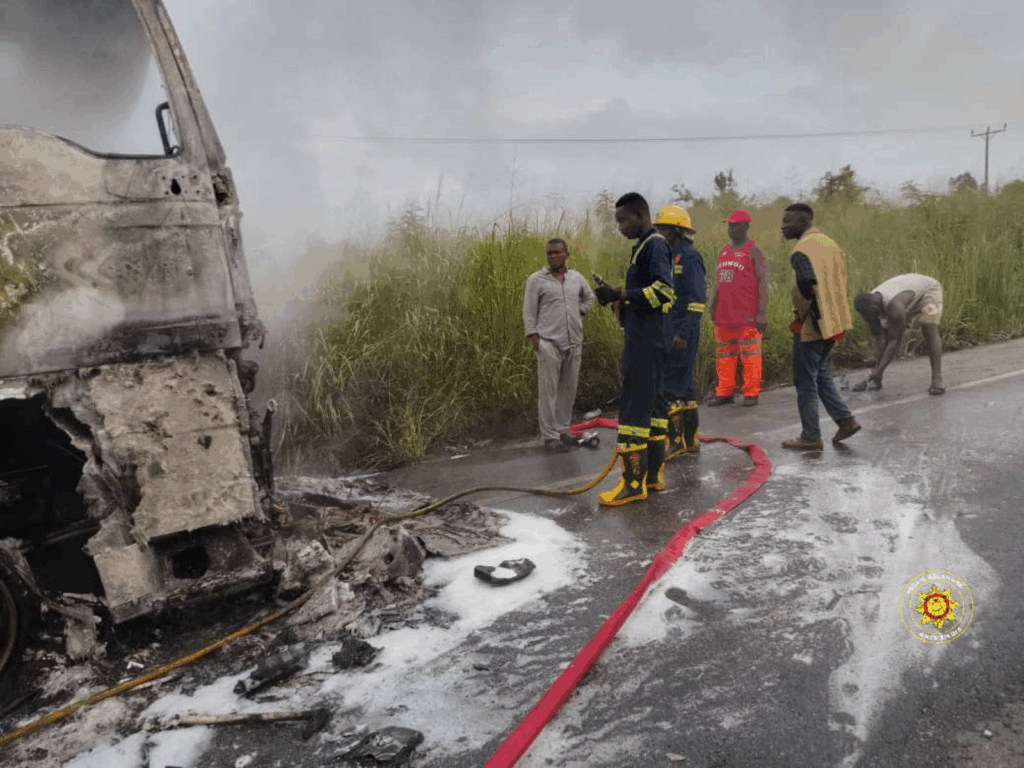 A MAN TGX26 trailer transporting bottled water caught fire on Wednesday, June 11, at Suhum Mile 44 on the Accra-Kumasi highway.