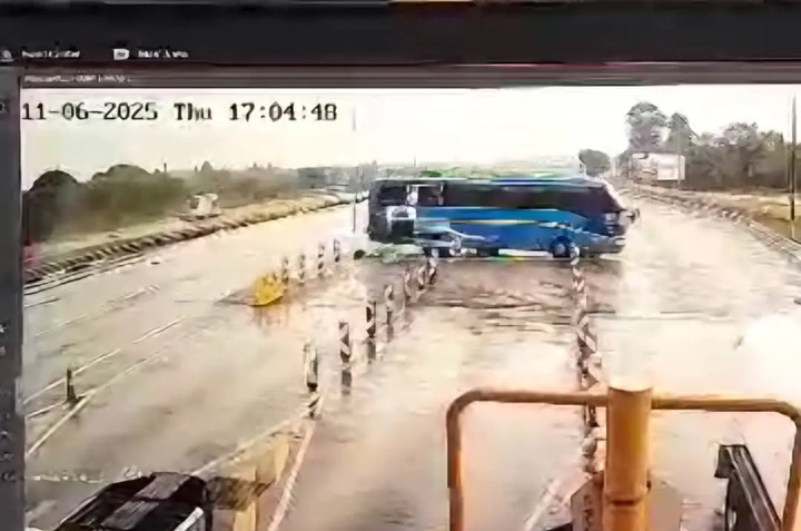 A heart-stopping incident was captured on CCTV at a toll gate in Zimbabwe on Thursday, 6th November 2025, showing a bus losing control under wet road conditions.